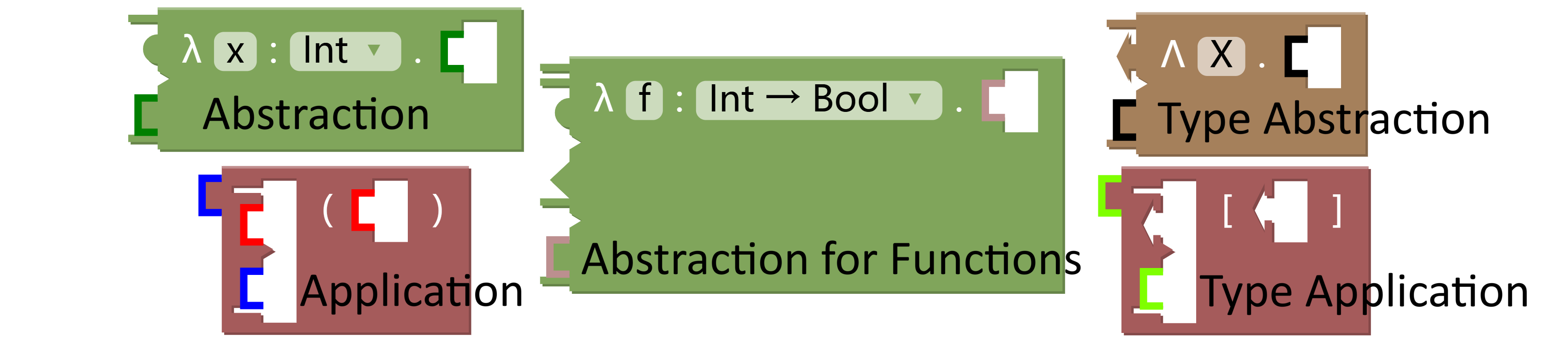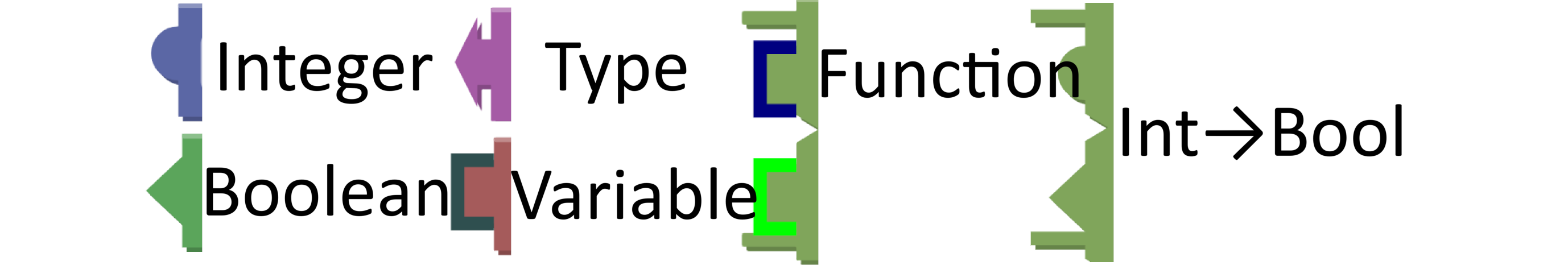 Integer type is represented with blue blocks with round protrusion, Boolean type is represented with green blocks with triangular protrusion.
